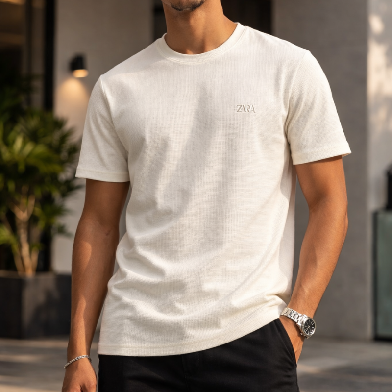 Camiseta Zara,  estilo, textura e qualidade em um único produto. E produzida com tecelagem especial que forma desenhos diretamente no tecido — trazendo elegância, durabilidade e um visual diferenciado.